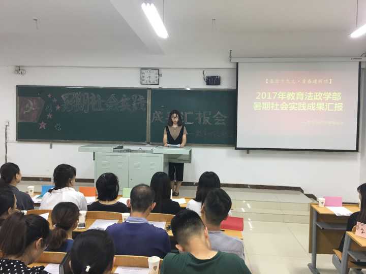 “喜迎十九大 青春实践行”教育法政学部2017年暑期社会实践活动圆满落幕-缩小 放大+ 2017-09-26在党的十九大胜利召开前夕,为鼓励引导青年学生深入社会、了解国情、关注民生,9月22日教育法政学部在第六教学楼303教室举办“喜迎十九大 青春实践行”暑期社会实践成果汇报活动,部长周桂英及全体辅导员老师与2017级同学们参加了本次活动。