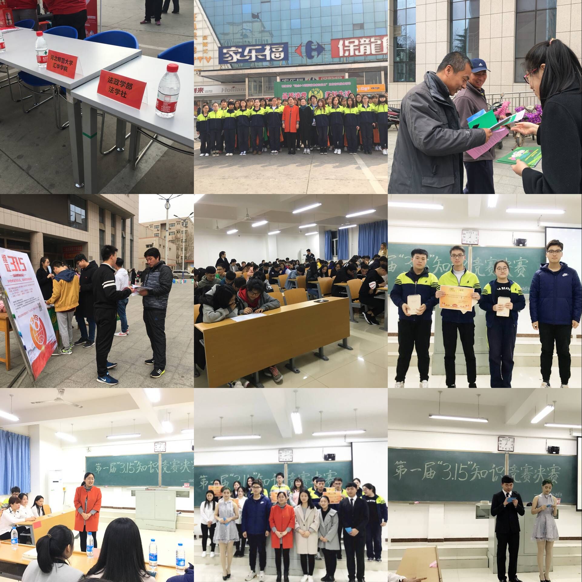 法政学部深入开展3.15法治宣传咨询系列活动-缩小 放大+ 2018-03-23为纪念“3·15”国际消费者权益日,广泛宣传《消费者权益保护法》,提高师生消费者维权意识,法政学部以法学社为载体组织开展3.15法治宣传咨询系列活动。 3月13日,法政学部与石家庄市工商局合作,在保龙仓购物广场参加石家庄市2018年“纪念3·15国际消费者权益日”宣传咨询服务活动,并在仪式结束后到特定展位进行普法宣传、法律咨询活动,同时向广大市民发放宣传手册、消费者维权宣传单及《河北省消费者权益保护条例》,尤其对于社会普遍关注的网络消费和老年消费进行了重点宣传,提醒消费者增强风险防范和自我保护意识。该项活动使法学专业学生将所学专业知识和社会实际密切结合,在服务社会中提高自身能力同时扩大了法学专业在社会上的影响力。 3月14日,法学社开展权益知识小课堂,进行校园内普法宣传,他们走进大一教室,通过PPT讲解的方式向同学们普及了消费安全方面的基本知识,通过2017年消费维权典型案例,增强消费者维护自己合法权益的信心。3月15日,法学社在北院食堂东门进行宣传,展出介绍消费者权益保护日的相关法律法规以及贴近大学生生活的消费安全事项的海报,让同学们了解基本的维权知识,树立维权意识。当晚,法学专业的学生集中观看了中央电视台3·15晚会,紧跟消费热点,了解消费生活中不为人知的“潜规则”,提高了学生们的消费意识,增强了维权观念。 3月13日、22日,法学社分别举办了首届消费者权益知识竞赛的初赛和决赛。初赛采用三人组队、试卷答题的形式进行,整个过程中每个人都全力思考,共同协作完成一份试卷,考场秩序井然,经过笔试的比拼,表现突出的五支队伍进入决赛。决赛分为轮答题、抢答题、风险题三个环节,题目内容贴近生活,生动有趣。赛场上,参赛队员们从容不迫、机智对答的表现和他们丰富的维权知识功底令现场观众掌声不断。经过激烈比拼后,产生优秀奖两队、三等奖一队、二等奖一队、一等奖一队,不仅决出高下还赛出了大学生的风采。