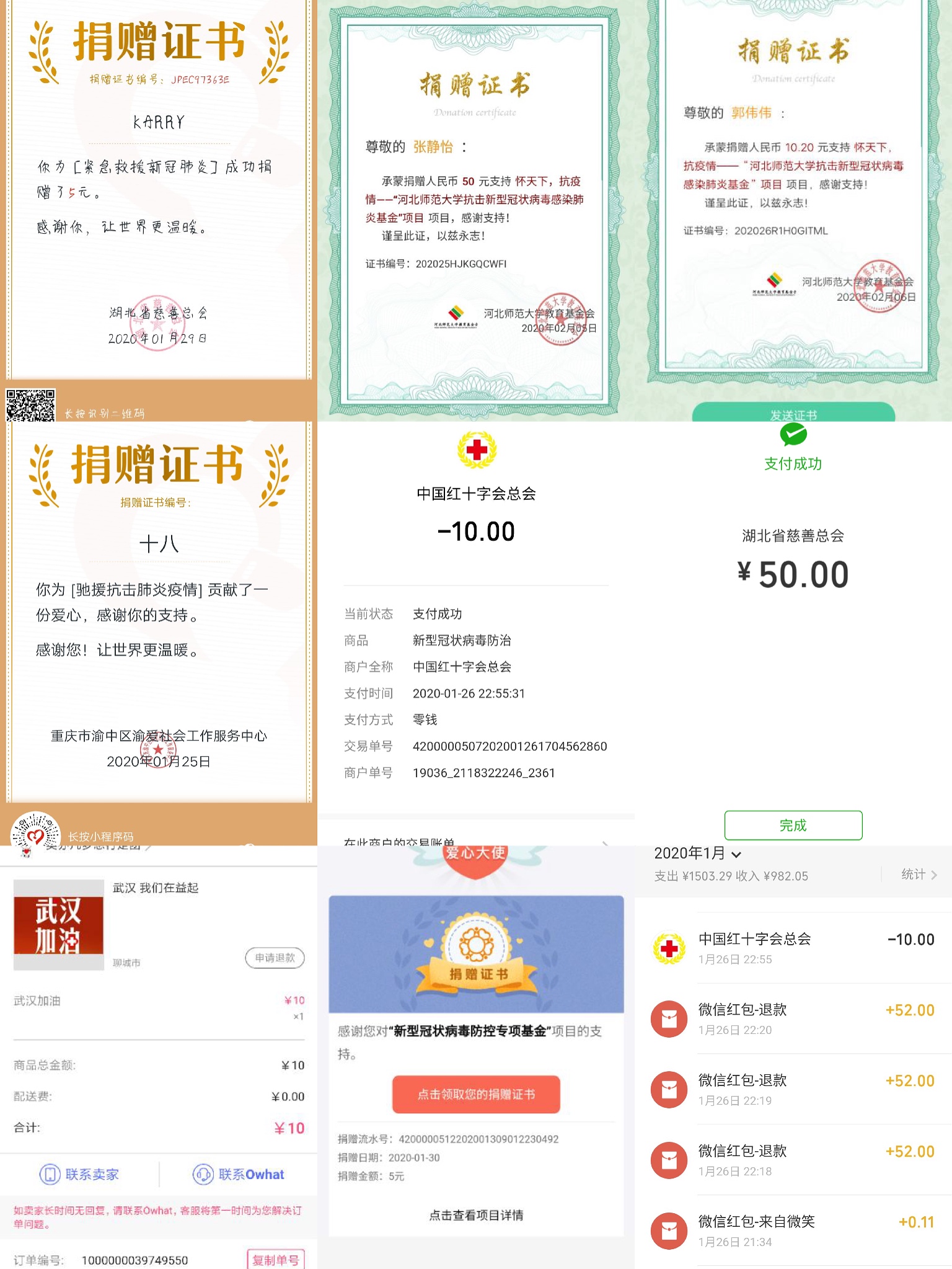 善款凝众志,爱心汇洪流。截止到2月8日,2018级法学专业、思想政治教育专业的高玉敏、宋新月等8位同学累计捐款220.20元。甘露同学及其家人捐赠红外线测温仪30个共计10500元。