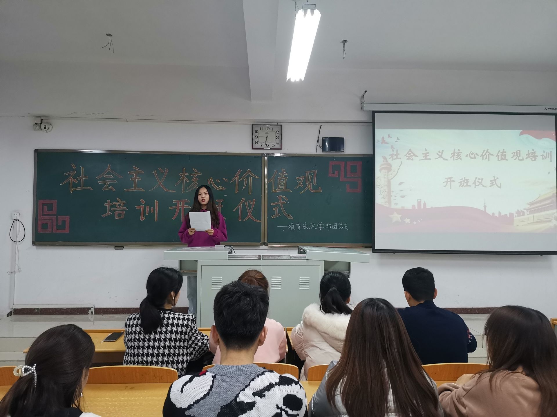 第六期社会主义核心价值观培训开班仪式顺利开展-缩小 放大+ 2020-11-2911月27日,教育法政学部在第六教学楼403教室举办第六期社会主义核心价值观主题培训班开班动员仪式,团总支书记张振伟老师参加本次活动。 活动伊始,由团总支副书记任航雨从视听课堂、专题讲座、交流分享以及学习成果汇报会四个环节介绍本次培训班的主要内容。随后团总支书记张振伟老师做开班动员讲话,指出社会主义核心价值观培训班作为教育法政学部的特色主题活动,是凝魂聚气,强基固本的基础工程。并借用陈鹤琴先生的名言鼓励同学们积极培育和践行社会主义核心价值观,厚植家国情怀,争做时代新人。