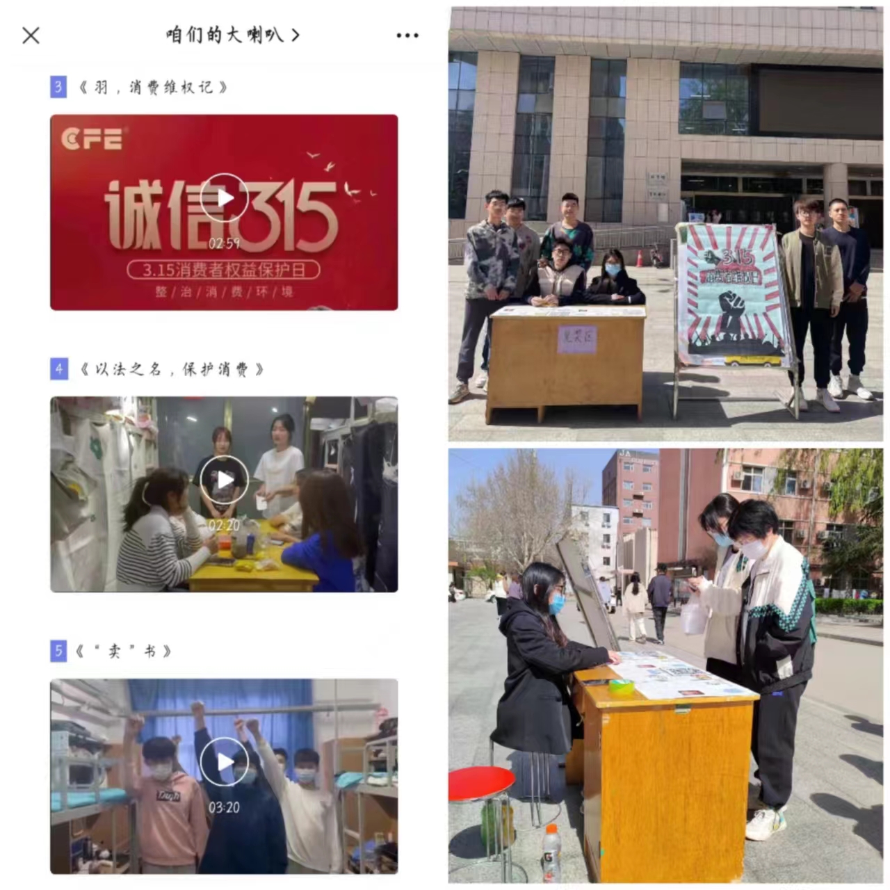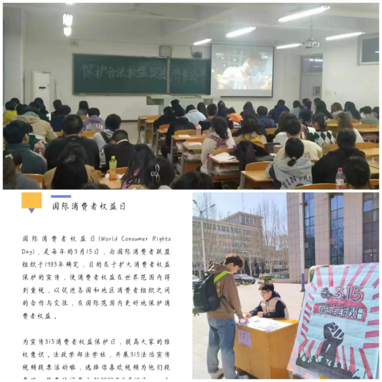 法政学部开展“保护合法权益,提振消费信心”315主题宣传活动-缩小 放大+ 2023-03-16每年的3月15日是“国际消费者权益日”。法政学部以法学社为载体围绕“保护合法权益,提振消费信心”主题,开展了普法宣传、征集315法治视频、集体观看315晚会等活动,宣传法律知识,增强师生的维权意识。