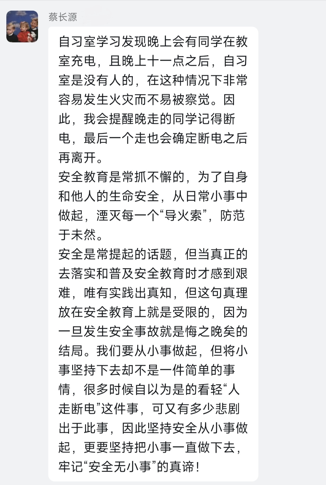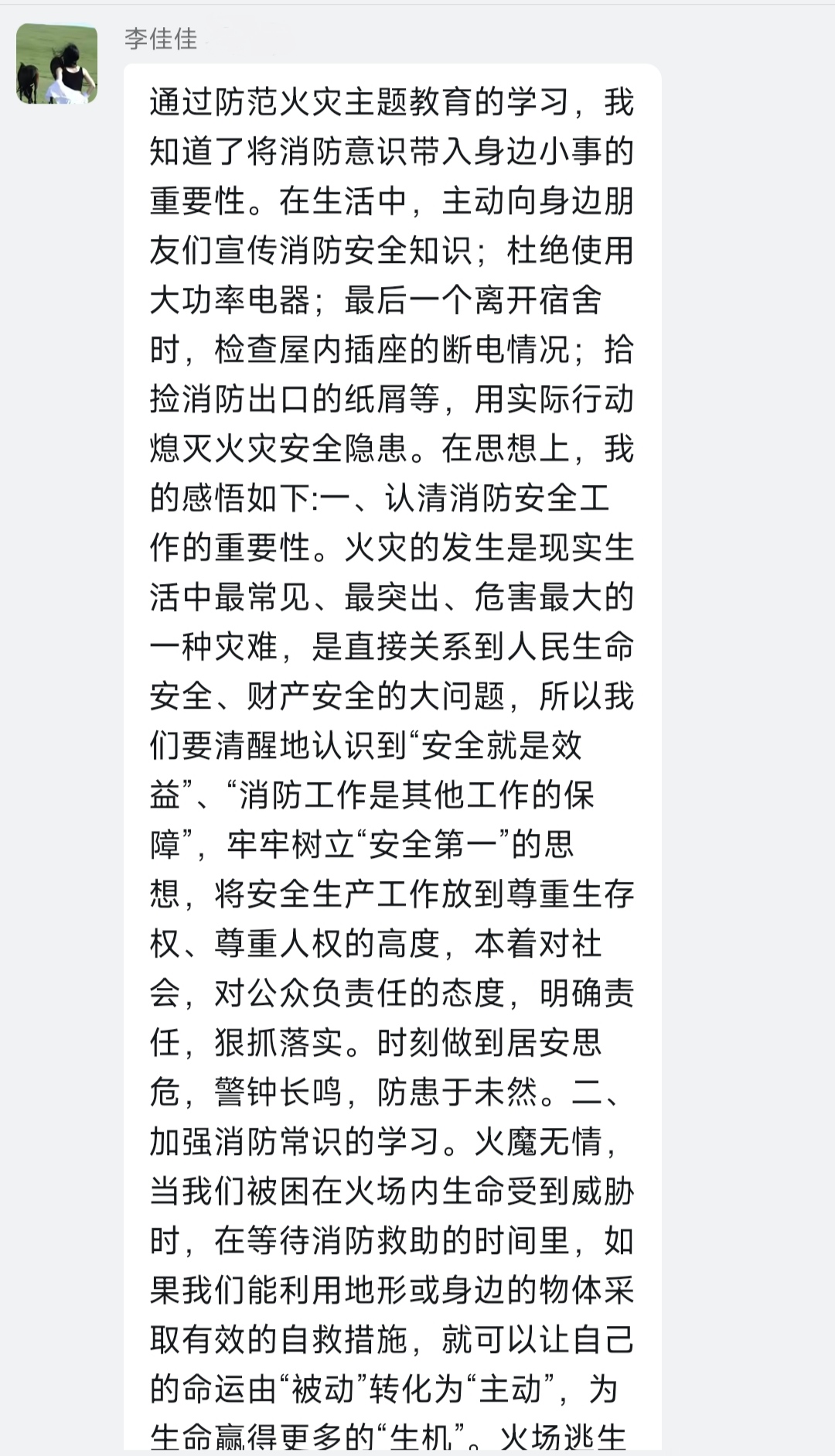 法政学部第一党支部开展安全教育党性活动-缩小 放大+ 2024-03-28为了进一步深入贯彻落实党中央、国务院关于安全工作的决策部署,提高学生校园安全意识、重视安全问题、培养正确的安全行为习惯,促进安全防护。3月份法政学部第一党支部全体党员开展了安全教育党性活动,法政学部党支部书记张星老师主持了本次活动。 张星老师引用真实生活中的火灾事故案例进行分析,详细讲述了安全用火、用电、用水等安全保障措施实施的必要性与严肃性,引导全体党员在日常生活中要肩负起防范安全风险的责任,积极发挥党员作用。本次活动提高了所有党员对安全问题的高度重视,促使全体党员主动学习应对风险的措施与方法,积极向身边同学传播安全知识,提高安全意识,做好日常的党员带头作用,能够更加认真对待校园安全的防护。 最后,全体党员根据此次活动内容,针对学校、宿舍、家庭中的安全隐患开展了安全教育实践活动,并发表了心得感悟。有党员谈到:在安全的问题上,来不得半点麻痹和侥幸,我们必须要防范在先、警惕在前,必须警于思、合于规、慎于行;必须要树立高度的安全意识,必须要筑起思想、行为和生命的安全长城。