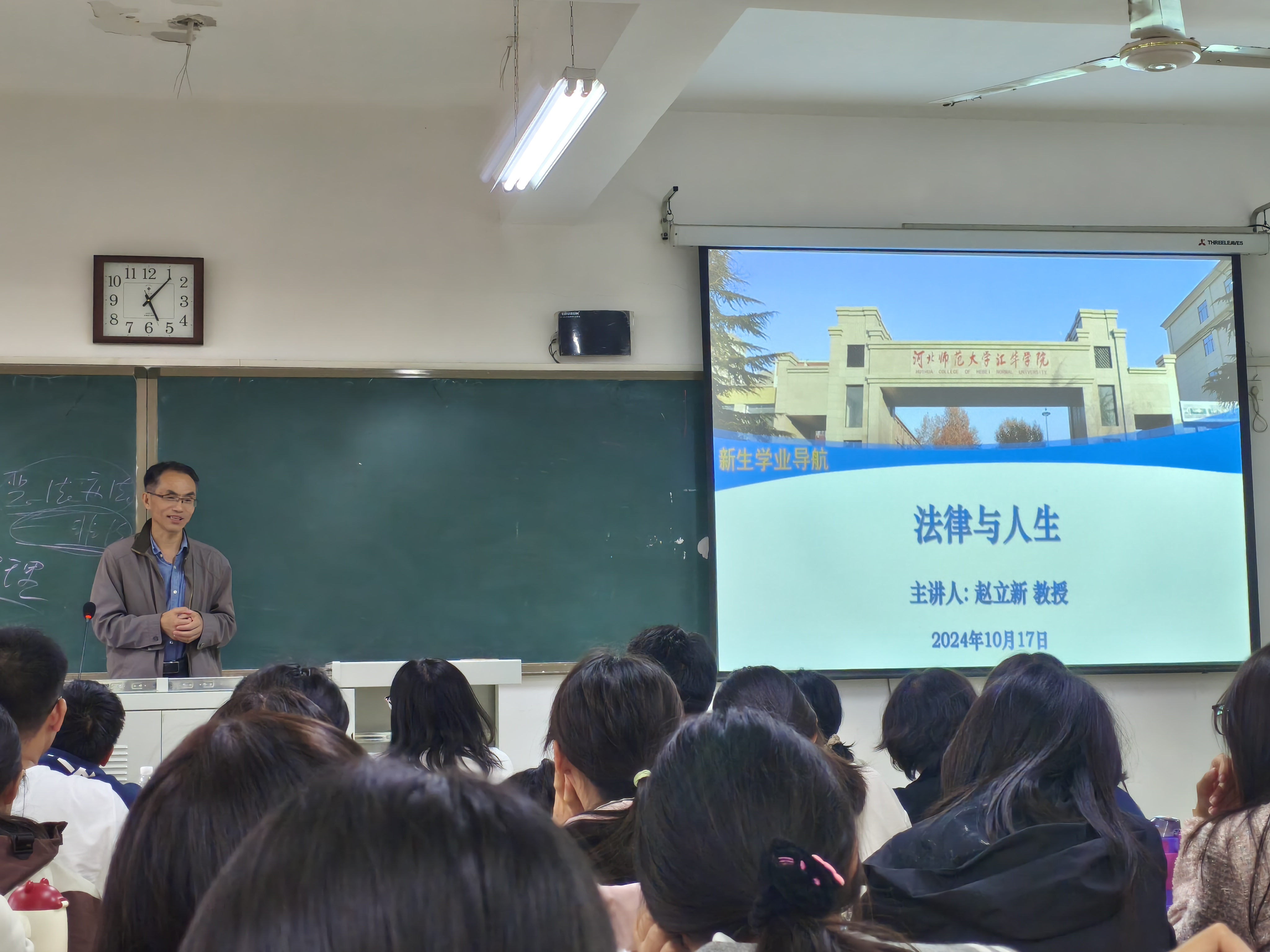 本次讲座主要围绕“法律与人生”主题进行讲述。赵立新教授着重讲了法律与人生的结合,并引用刑法、民法、社会保障法等生活中的典型案例为同学们分析与讲解,做出了充分阐释,告诉青年学子法律与生活息息相关,紧密联系,应在大学中坚定努力学习专业知识的信心决心,激发了在场学生对法学专业学习的喜爱与热情。赵立新教授还以“考公”“考研”“考证”等法学专业实际发展方向为切入口,针对不同发展路径给同学们提出了针对性的指导建议,缩短了大一新生对此方面的信息差距离,每一位同学受益匪浅。除此之外,赵老师还与同学们进行了现场交流互动,为同学们解疑释惑。最后,赵立新教授语重心长,希望法学专业新生要热爱自己的专业,锚定目标,坚定信心,勇往直前,勤奋学习,夯实基础,为自己的未来而努力奋斗,取得更好的成绩。
