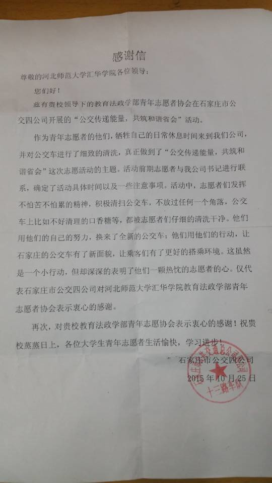 公交传递能量,共筑和谐省会-缩小 放大+ 2015-10-28为培养学生的社会责任意识与服务意识,10月25日,教育法政学部组织青年志愿者开展了以“公交传递能量,共筑和谐省会”为主题的义务活动。 志愿者们来到石家庄公交四公司,按照计划,分组行动。他们认真清理公交车内的窗框、门框、座椅等一系列细小入微的地方,工作虽然繁琐,但每一位志愿者都干得非常卖力,天气的寒冷阻挡不住大家奉献的热情。公交四公司的工作人员也为志愿者们就公交运行体系、如何正确乘坐公交车以及遇到突发事件时如何处理等一系列问题进行了详细讲解,并组织大家进行了逃生演练,志愿者们认真聆听工作人员的讲解,将安全常识牢记在心。 通过此次活动,学生们了解到城市公交的现状及基本情况,掌握了安全乘坐公交车的知识,同时,他们用自己的实际行动践行了青年志愿者的使命,向社会传递了正能量,展现了当代大学生热爱学习、无私奉献的精神风貌,为共同构建美好和谐省会贡献了自己的力量。