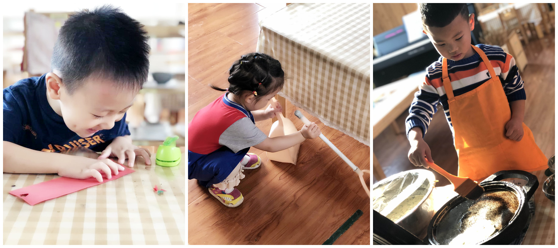 孩子们在日常生活区,操作与日常生活息息相关的教具,小手肌肉的灵活性、照顾自己、照顾环境的技能,独立自主、责任感、自信心、专注力、交往能力都在与日俱增。2-3岁的孩子也可以自我照顾,系着围裙自己擦桌子、擦玻璃,走来走去忙的不亦乐乎;小小的责任心开始在心中萌芽!