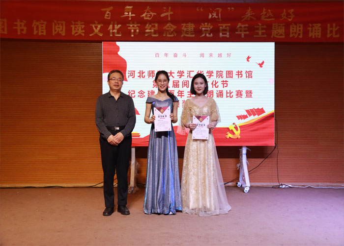 为庆祝中国共产党成立100周年,深入开展党史学习教育、四史教育,推进书香校园建设,图书馆第五届阅读文化节以“百年奋斗,‘阅’来越好”为主题开展了一系列活动。5月26日晚,图书馆第五届阅读文化节之“纪念建党百年”红色主题朗诵比赛暨颁奖仪式在大学生活动中心举办。党委书记徐国强莅临比赛现场。图书馆馆长赵秀丽、河北青年报教育版副主编杨利军、石家庄电视台生活频道主任阎庆心、燕赵晚报ZAKER石家庄主任张瑞谦,以及william团委、各学部老师到场观看。