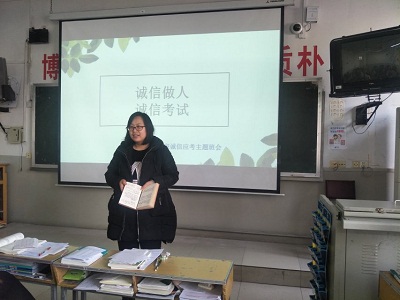 1月5日下午,2016级化学一班全体同学于二教304室开展以“诚信做人,诚信做事”为主题的班会活动。本次班会由纪律委员尹晓玉和学习委员许怡飞主持,旨在鼓励同学们遵守考试纪律,做一个诚实守信的人。