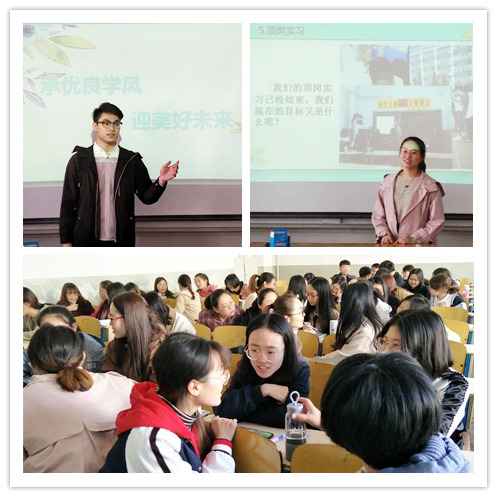 此次班会包括三部分主题内容。“回顾过去——忆往昔峥嵘岁月稠”环节,班长带领大家回顾了本班大一大二两年的学风建设情况、班级活动、本班所取得的成绩以及获奖情况,再次重申优良的学风需要大家的共同努力。此环节还总结了同学们在顶岗实习学期所付出的辛苦,大家积极发言并分享了在实习中酸甜苦辣。“立足现在——厚积薄发出真知”环节。同学们展开讨论,明确自己的目标并做出适当的规划,为同学们在未来的大学生活指明了方向。最后,在“展望未来——放飞梦想,迎接朝阳”环节,同学们积极发言,纷纷表态要脚踏实地为自己的目标而奋斗。
