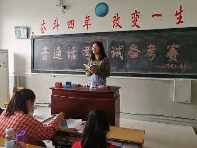 语言是人与人交往的第二双眼睛,而普通话是我们心灵沟通的桥梁。作为一名师范生,流利的普通话更是教师必备的一项实践教学素质技能。为了让同学们提高普通话水平,拓展综合素质,2017级化学专业1班在4月26日于二教411举行了一场普通话考试备考赛。2017级化学一班全体同学参与此次活动。
