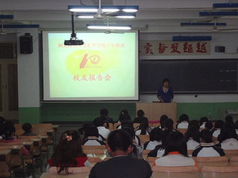 2011年10月20日,在文学楼115教室,05级生物科学学生刘敏为2011级新生进行了校友报告会。 刘敏从“人生规划”“明确目标”“学习方法”“把握机会”等方面进行了详细地讲解,并强调了目标的重要性。刘敏同学指出:在大学生活中同学们应该培养独立自主的学习观念、与人交往时应端正态度,注重思想道德方面的修养。报告会最后,刘敏同学耐心解答了同学们提出的问题,同学们收获颇多。 此次报告会为同学们今后的学习发展提供了良好的方向,使同学们可以更好地适应大学的学习和生活。