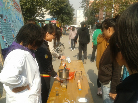 近日,理学部化学专业2010级学生于北院第六餐厅门前举办化学专业展示活动。 专业展示包括“煮熟的鸡蛋”、“不会燃烧的棉团”、“氢气球”、“指纹鉴定”等四个趣味实验,实验丰富精彩,引人注目。化学专业2010级学生从实验原理、目的、原料、性质等多方面、多角度、多层次进行现场讲解,吸引了众多化学爱好者。 理学部始终坚持从严治学,从严执教,多次邀请知名学者到学部进行讲座。专业特色展示活动是该学部加强学风建设的重要组成部分,通过对该学部各专业特色的集中展示,进一步明确了专业性质,激发了广大学生的专业学习兴趣,促进了学院大类招生相关政策的更好实施。