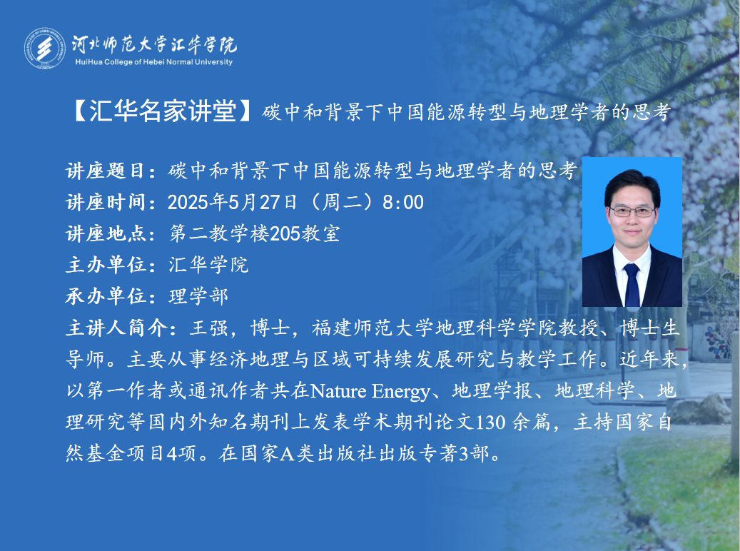 讲座题目:碳中和背景下中国能源转型与地理学者的思考讲座时间:2025年5月27日(周二)8:00讲座地点:第二教学楼205教室主办单位:william威廉中文官网承办单位:理学部主讲人:王强主讲人简介:王强,男,博士,福建师范大学地理科学学院教授、博士生导师。主要从事经济地理与区域可持续发展研究与教学工作。近年来,以第一作者或通讯作者共在Nature Energy、Landscape and Urban Planning、Sustainable Cities and Society、Applied Energy、Renewable Energy、Energy、地理学报、地理科学、地理研究等国内外知名期刊上发表学术期刊论文130余篇,主持国家自然基金项目4项。在国家A类出版社出版专著3部。研究成果获得福建省社科一等奖1项、青年佳作奖1项,民政部行政理论研究三等奖1项。获福建省青年教师教学能手、思政教学名师称号,主持省级重大教改项目1项,获教学成果奖二等奖2项。内容简介:在碳中和背景下,中国能源转型不仅是技术革新与政策驱动的过程,更是一场深刻的地理空间重构。地理学者需以系统性视角剖析能源生产与消费的空间失衡。地理学以其跨学科优势,正为构建人地协调的碳中和路径提供科学支撑,助力中国在能源革命中实现生态保护、经济转型与区域公平的多维共赢。