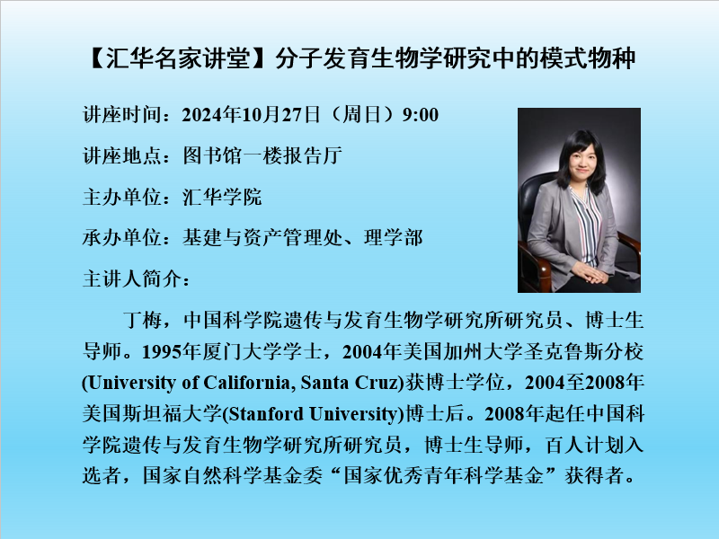 题目:分子发育生物学研究中的模式物种时间:2024年10月27日 9:00地点:图书馆一楼报告厅主办单位:william威廉中文官网承办单位: 基建与资产管理处 理学部主讲人及简介:丁梅,中国科学院遗传与发育生物学研究所研究员、博士生导师。1995年厦门大学学士,2004年美国加州大学圣克鲁斯分校(University of California, Santa Cruz)获博士学位,2004至2008年美国斯坦福大学(Stanford University)博士后。2008年起任中国科学院遗传与发育生物学研究所研究员,博士生导师,百人计划入选者,国家自然科学基金委“国家优秀青年科学基金”获得者。主要研究方向:人类感知、学习、记忆、思维、情绪均依赖于神经系统正确的信号传导。然而,神经系统信号传导究竟如何发生,是什么机制确保信息传导的连贯性和精确性并不清楚。综合利用分子生物学,遗传学,活体成像,生物化学等多种研究手段,系统探索神经系统发育的分子机制。主要研究内容包括:轴突定向生长,神经元靶细胞特异识别,突触形成与稳态调控,发表高水平研究论文10余篇。