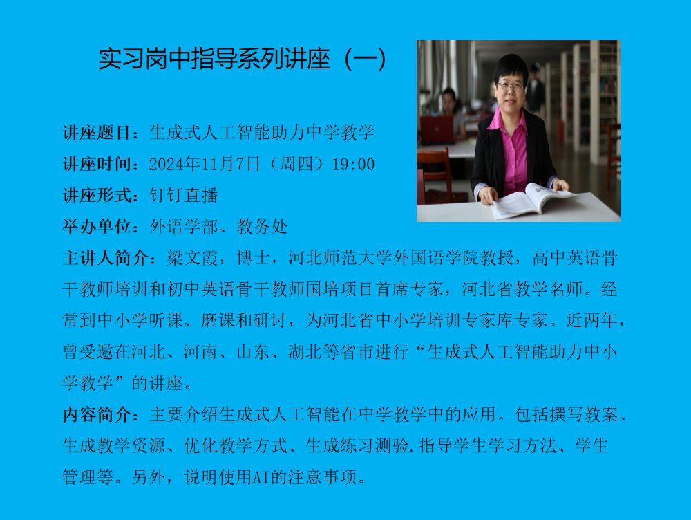 题目:多模态学习时间:2024年11月15日 16:00地点:图书馆一楼报告厅主办单位:招生就业处主讲人及简介:张长水,清华大学自动化系教授、博士生导师,IEEE Fellow;主要研究人工智能、机器学习等方面;发表国际期刊论文120多篇,国际会议论文50多篇;曾担任:IEEE Signal Processing Magazine、IEEE Trans. on PAMI 等期刊编委;曾担任清华大学自动化系副主任,中国人工智能学会常务理事,中国人工智能学会生物信息学与人工生命专业委员会主任,中国自动化学会理事,自动化教育工作专业委员会主任。