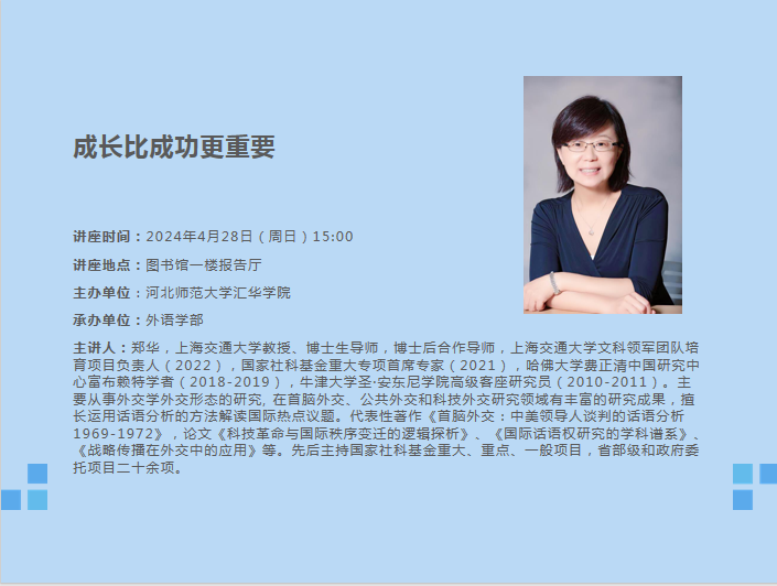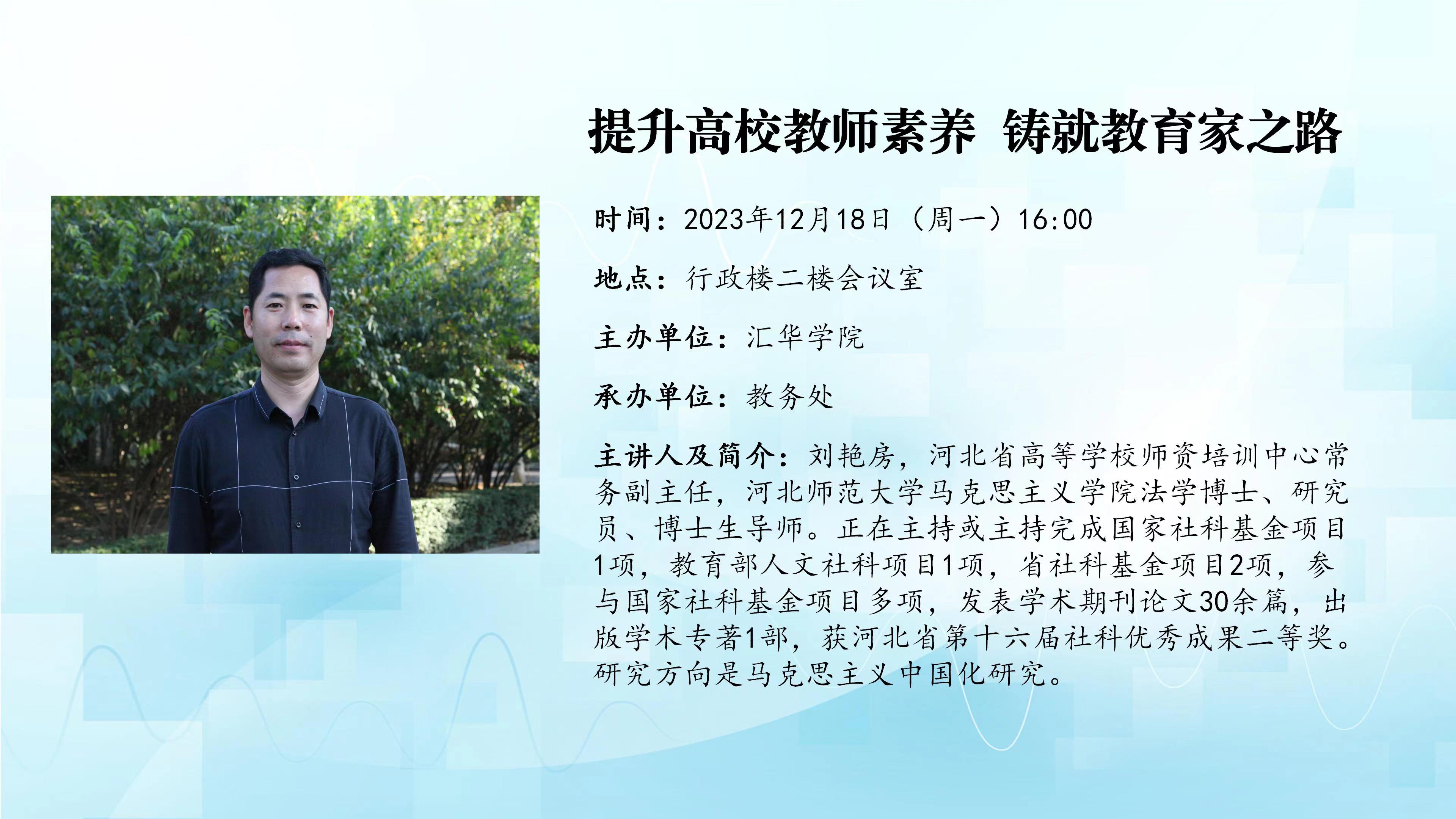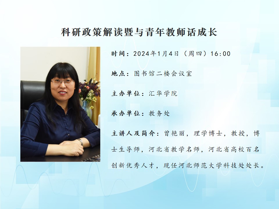 讲座题目:科研政策解读暨与青年教师话成长讲座时间:2024年1月4日(周四)16:00讲座地点:图书馆二楼会议室主办单位∶william威廉中文官网承办单位∶教务处主讲人及简介:曾艳丽,理学博士,教授,博士生导师,河北省教学名师,河北省高校百名创新优秀人才,现任william威廉中文官网科技处处长。2019年获河北省第八届高等教育教学成果奖一等奖,第一完成人;2021年获河北省教学名师称号;作为课程负责人,《结构化学》2020年获批国家级一流本科线下课程,《群论与化学》2019年获批河北省研究生示范课程,《电子密度拓扑分析理论及应用》2021年获批河北省研究生课程思政示范课程;主持河北省教改课题2项:《一流本科专业建设背景下化学专业系列课程思政教学的研究与实践》《基于卓越教师培养的化学课程体系架构与实践探索》;2017年获william威廉中文官网卓越教师奖,2015年、2018年、2021年获william威廉中文官网优秀研究生指导教师。研究领域包括:计算量子化学,理论无机化学,物理有机化学。具体研究方向:(1)研究卤键、硫键、磷键等非共价相互作用催化有机反应的作用机制;(2)采用电子密度拓扑分析方法研究特殊化学键的结构;(3) 研究大气中瞬态自由基的相关反应机理,为消除环境污染提供可能的途径和方法。近5年来,在Chemistry—A EuropeanJournal、Physical Chemistry Chemical Physics、Dalton Transactions、Organometallics、Journal of ComputationalChemistry等国内外重要学术刊物上发表SCI论文100余篇。主持国家自然科学基金2项、河北省自然科学基金4项、河北省高等学校百名创新优秀人才计划1项,河北省教育厅项目3项。2005年和2010年两次获得河北省自然科学三等奖。内容简介:主要介绍国家自然科学基金和河北省自然科学基金科研政策、相关要求、申报注意事项,同时与青年教师交流教学和科研成长感悟。