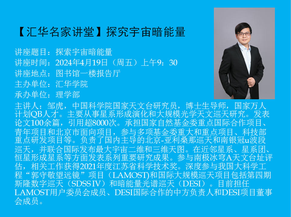 讲座题目:探索宇宙暗能量讲座时间:2024年4月19日上午9:30讲座地点:图书馆一楼报告厅主办单位:william威廉中文官网承办单位:理学部主讲人:邹虎主讲人简介:邹虎,中国科学院国家天文台研究员,博士生导师,国家万人计划QB人才。主要从事星系形成演化和大规模光学天文巡天研究。发表论文100余篇,引用超8000次。承担国家自然基金委重点国际合作项目、青年项目和北京市面向项目,参与多项基金委重大和重点项目、科技部重点研发项目等。负责了国内主导的北京-亚利桑那巡天和南银冠u波段巡天,并联合国际发布最大宇宙二维和三维天图。在近邻星系、星系团、恒星形成星系等方面发表系列重要研究成果。参与南极冰穹A天文台址评估,相关工作获得2021年度江苏省科学技术奖。深度参与我国大科学工程“郭守敬望远镜”项目(LAMOST)和国际大规模巡天项目包括第四期斯隆数字巡天(SDSS IV)和暗能量光谱巡天(DESI)。目前担任LAMOST用户委员会成员、DESI国际合作的中方负责人和DESI项目董事会成员。内容简介:我们的宇宙到底长什么样子?宇宙有多大?宇宙是否是静止的?宇宙到底是由什么组成的?那么生活在地球上的我们,如何去探索宇宙奥秘呢?本报告将介绍目前世界上最强大的观宇利器——暗能量探测仪DESI,它能探测到120亿年前宇宙早期的天体信号,构建出三维宇宙空间,从而揭开宇宙“暗能量”谜团。报告将从DESI项目最近发布的科普球幕电影《5000 Eyes Mapping the Universe with DESI》(中文名《千眼观宇百亿年》)开始,带领大家见识这台强大的仪器,并对其进行详细的讲解,介绍其采用的诸多科技、中国在这个大型国际合作项目中的重要贡献以及DESI首年巡天的重要科学发现。