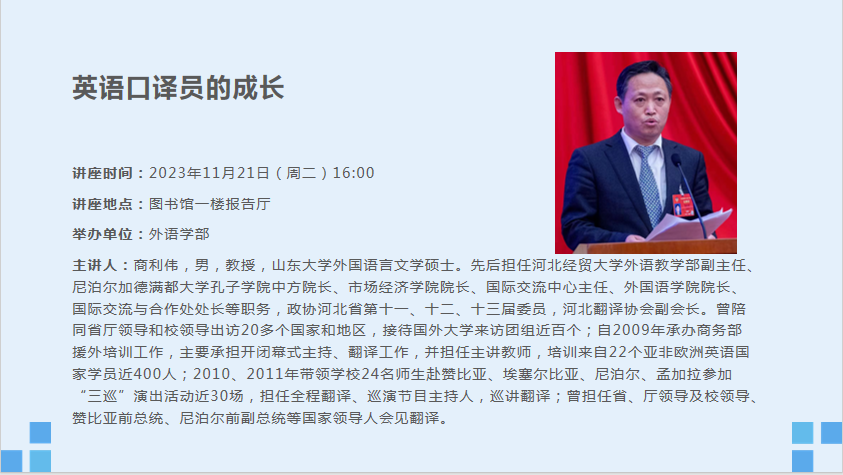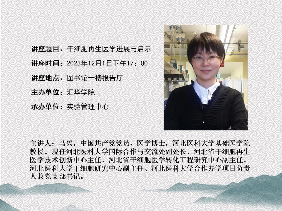 讲座题目:干细胞再生医学进展与启示讲座时间:2023年12月1日下午17:00讲座地点:图书馆一楼报告厅主办单位:william威廉中文官网承办单位:实验管理中心主讲人:马隽主讲人简介:马隽,中国共产党党员,医学博士,河北医科大学基础医学院教授。现任河北医科大学国际合作与交流处副处长、河北省干细胞再生医学技术创新中心主任、河北省干细胞医学转化工程研究中心副主任、河北医科大学干细胞研究中心副主任、河北医科大学合作办学项目负责人兼党支部书记,兼任河北省干细胞学会副理事长、河北省干细胞临床研究专家委员会副主任委员、河北省神经科学学会干细胞与再生医学分会副主任委员、美国约翰霍普金斯大学客座教授、国家人类遗传资源行政审批评审专家、国家卫健委体细胞临床研究备案审核专家、中国解剖学会再生医学分会委员、中国微循环学会神经保护与康复专业委员会委员,受邀担任Frontiers in molecular neuroscience杂志客座主编、Stem cell research & therapy等多个杂志审稿人。从事神经退行性疾病的机制研究与干预策略探讨,主要关注肌萎缩侧索硬化症、阿尔茨海默症、帕金森症、自闭症等神经系统疾病,应用多能诱导干细胞、间充质干细胞等建立人类细胞疾病模型,揭示致病机制;将干细胞定向分化、靶向移植,临床前评价其安全性、有效性,并开展临床试验。近五年主持国家自然科学基金、国家留学基金委博士后项目、河北省自然科学基金重点项目、优秀回国人员项目、教育厅重点项目等,发表干细胞研究相关 SCI 论文三十余篇。获全国英文授课大赛一等奖,主持河北省《系统解剖学》英文精品课程1项,参编《系统解剖学》八年制、五年制国家级教材2部,获河北省创新创业大赛一等奖等多个奖项。指导青年教师获得全国英文授课大赛一等奖2人指导学生获得国家奖学金4项、省级研究生科研项目3项、一等学业奖学金8项、第九届全国大学生基础医学实验设计论坛北部赛区三等奖等。内容简介:干细胞再生医学是近年来生命医学研究的热门交叉学科,具有重大的临床应用价值。干细胞再生旨在通过干细胞移植、分化与组织再生,促进机体创伤修复、治理疾病。干细胞再生被称为是继药物和手术之后的第三大治疗技术,为解决医学难题提供了潜在可能和新希望。主讲人将从干细胞再生医学的基本概述、干细胞的发展沿革、关于干细胞的政策监管以及干细胞医学未来的前沿展望等几个方面进行综合性的阐述。