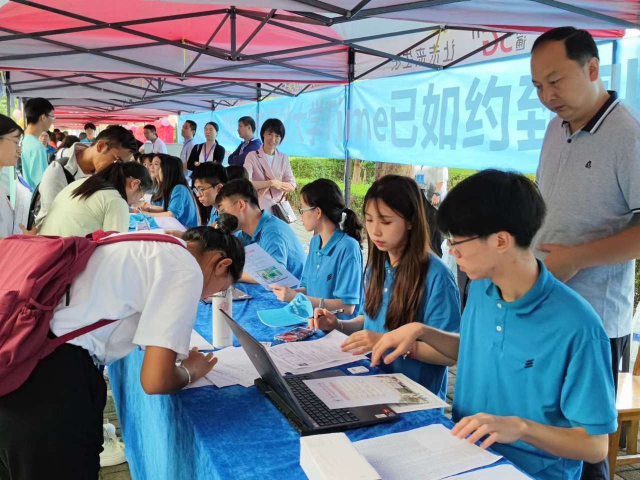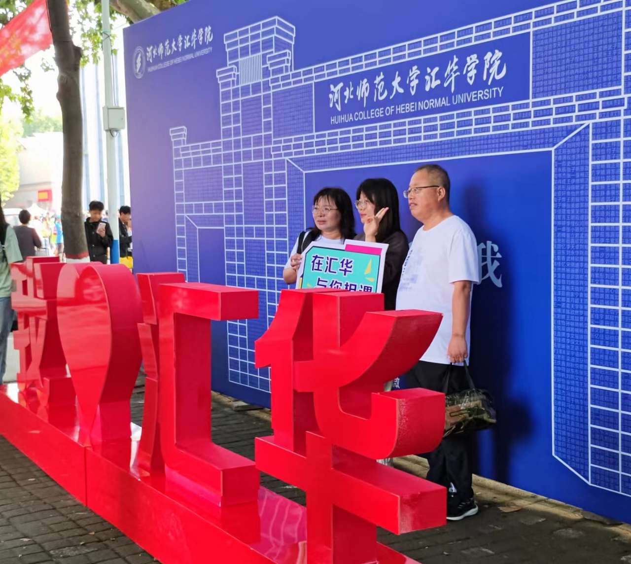 学院领导来到报到现场,指导迎新工作,与新生及家长亲切交流、慰问工作人员和志愿者,希望同学们尽快融入校园生活,勤奋钻研,度过美好的大学时光。各单位别出心裁的花式迎新给新生带来独特的“汇华式初印象”。招生就业处在主干道起点设立新生报到咨询处,耐心为新生及家长答疑解惑。学生处和团委制作了“欢迎新同学”“我爱汇华”立体字标,新生纷纷驻足合影。工学部朋友圈动态截图的迎新展牌让人眼前一亮、独树一帜,框出了新生的欣喜和梦想,文字评论饱含学长学姐的深情祝福。理学部制作了“在汇华与你相遇”“无奋斗不青春”手持牌供新生合影留念。文学部书法工作室现场为新生撰写毛笔字书签,汉服社展示了中国传统文化。传媒学部青年志愿者到火车站迎接新生,为每一位奔波到来的新生指明“回家的方向”。经济管理学部于9月11日上午安排了新老生交流会,学长学姐分享学习心得和生活经验,帮助新生更好适应大学生活。教育学部法政学部有序组织新生及家长参观教学楼、餐厅、图书馆等基础设施,并讲解“超越自我,开创未来”校训的内涵,志愿者为新生及家长在学院标志性建筑拍摄留念照片。外语学部提前召开班会,为新生讲解报到注意事项。艺术学部为新生精心设计了手提布袋和手绘校园导图,让新生感受宾至如归的温情与暖意。