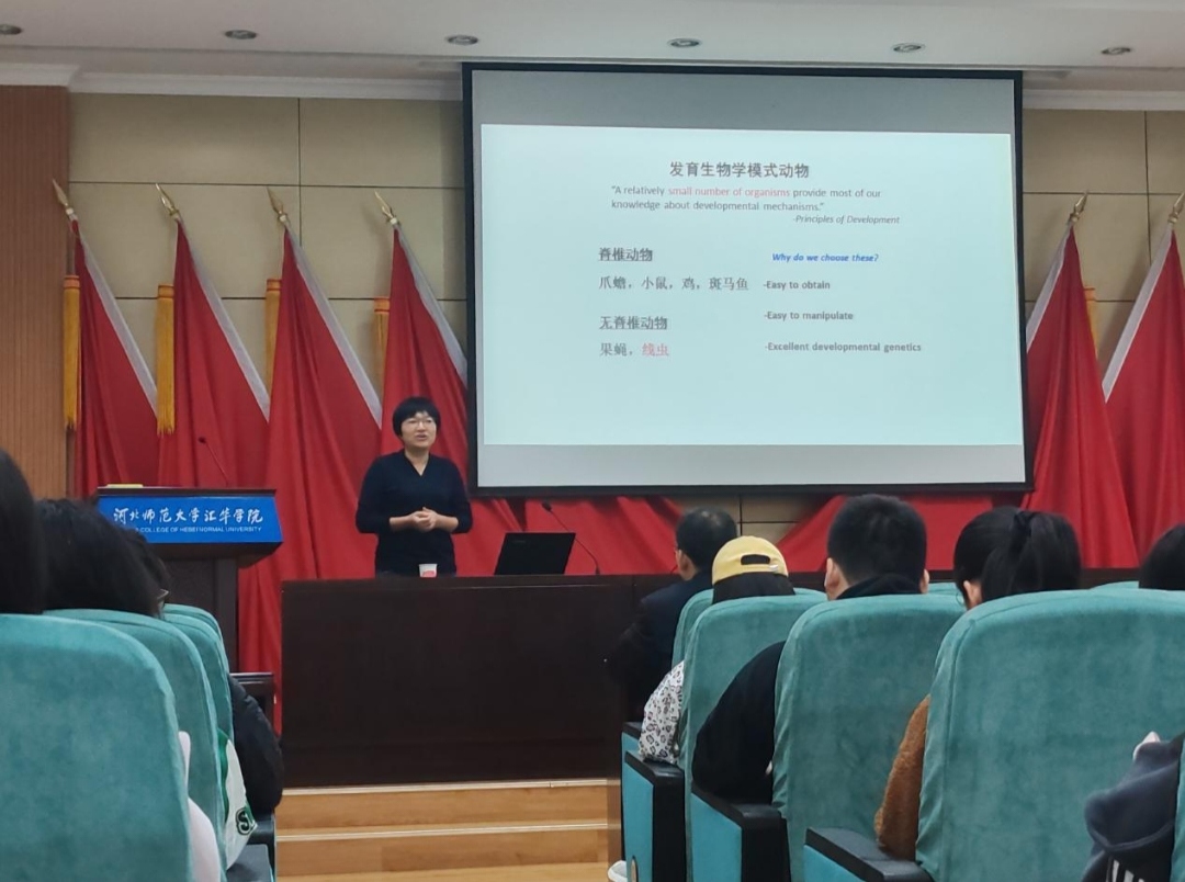 10月27日,中国科学院遗传与发育生物学研究所研究员、博士生导师丁梅做客“汇华名家讲堂”,在图书馆一楼报告厅作题为“发育动物学模式动物”的学术报告。理学部部长张增水主持报告会,理学部教学工作副部长、辅导员以及生物科学专业160余名学生到场聆听。
