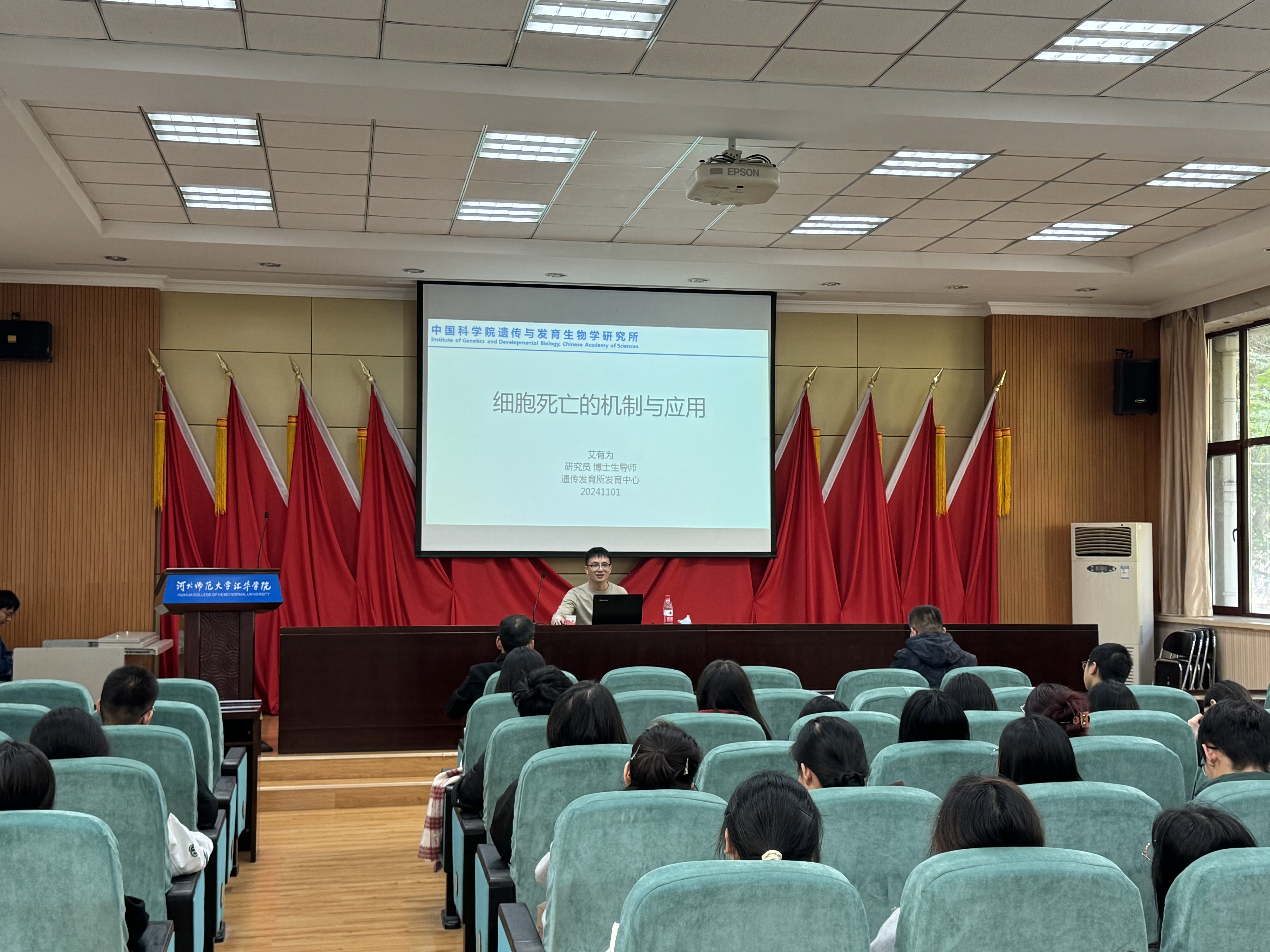 艾有为首先分享了自己的学术成长历程,回顾了从本科到博士期间的学习和研究经历。他强调,扎实的基础知识和科研实践是推动科学进步的关键。详细介绍了团队的研究方向,重点讲解了在癌症治疗和传染病领域的研究进展,细胞死亡机制的研究不仅有助于深入理解疾病的本质,还为新药的研发提供了重要的理论基础和应用前景。艾老师通过生动的案例使在场的同学们对相关领域的前沿进展有了更加全面的认识。艾有为老师与在场的学生进行了互动,耐心解答了同学们提出的问题,进一步激发了学生们的学习热情,也增强了他们对生物科学研究的兴趣。