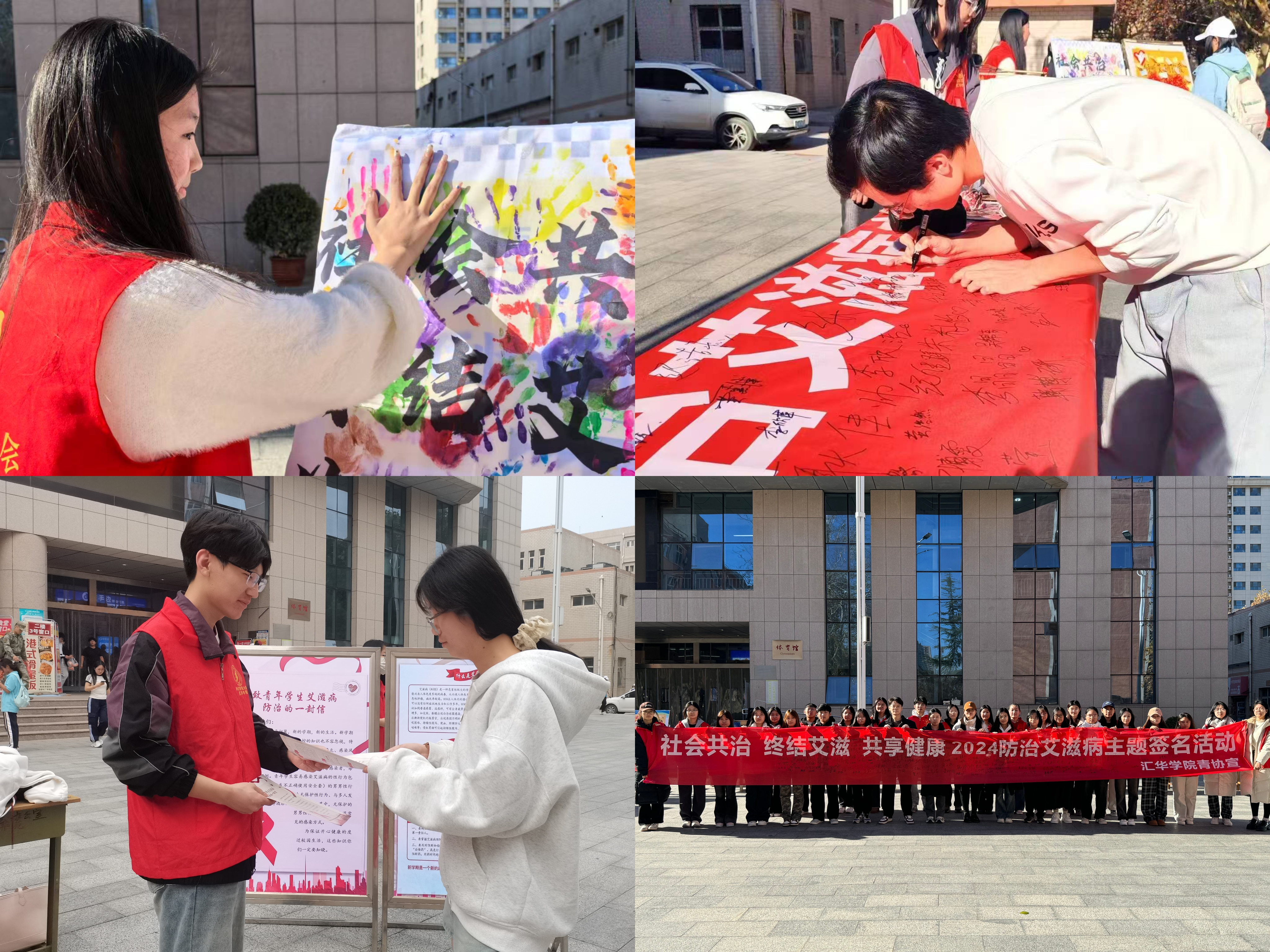 11月29日,在第37个世界艾滋病日即将来临之际,院团委、门诊部于食堂东广场开展了以“社会共治,终结艾滋,共享健康”为主题的宣传活动。本次活动分为四位环节,“拒绝艾,拥抱爱”的拥抱活动环节,传递了温暖与关怀;“以爱之名,为艾发声”展示了众多优秀防艾创意作品;“‘签’手防艾,让爱无‘碍’”签名活动彰显了大家的防艾决心;“手印传情,防艾同行”DIY 活动激发了参与者们的热情;“防艾知艾,让爱传递”有奖竞答活动在互动中普及了防艾知识。