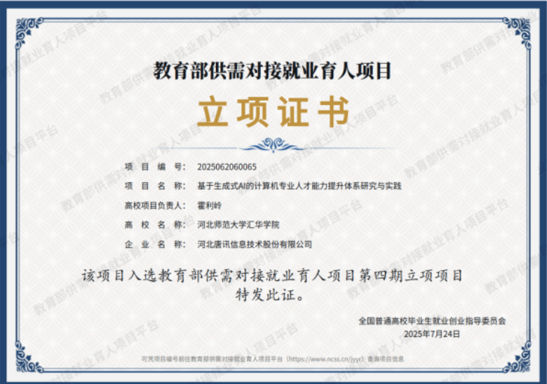 本次立项的课题将紧密围绕人工智能应用领域,加强与东软教育科技集团有限公司、河北唐讯信息技术股份有限公司的深度合作,以产学研协同为核心理念,构建“需求导向、学科交叉、实践驱动”的人才培养体系及课程建设体系,力求实现人才培养与产业需求精准对接,为区域经济发展提供人工智能领域高素质人才支撑。