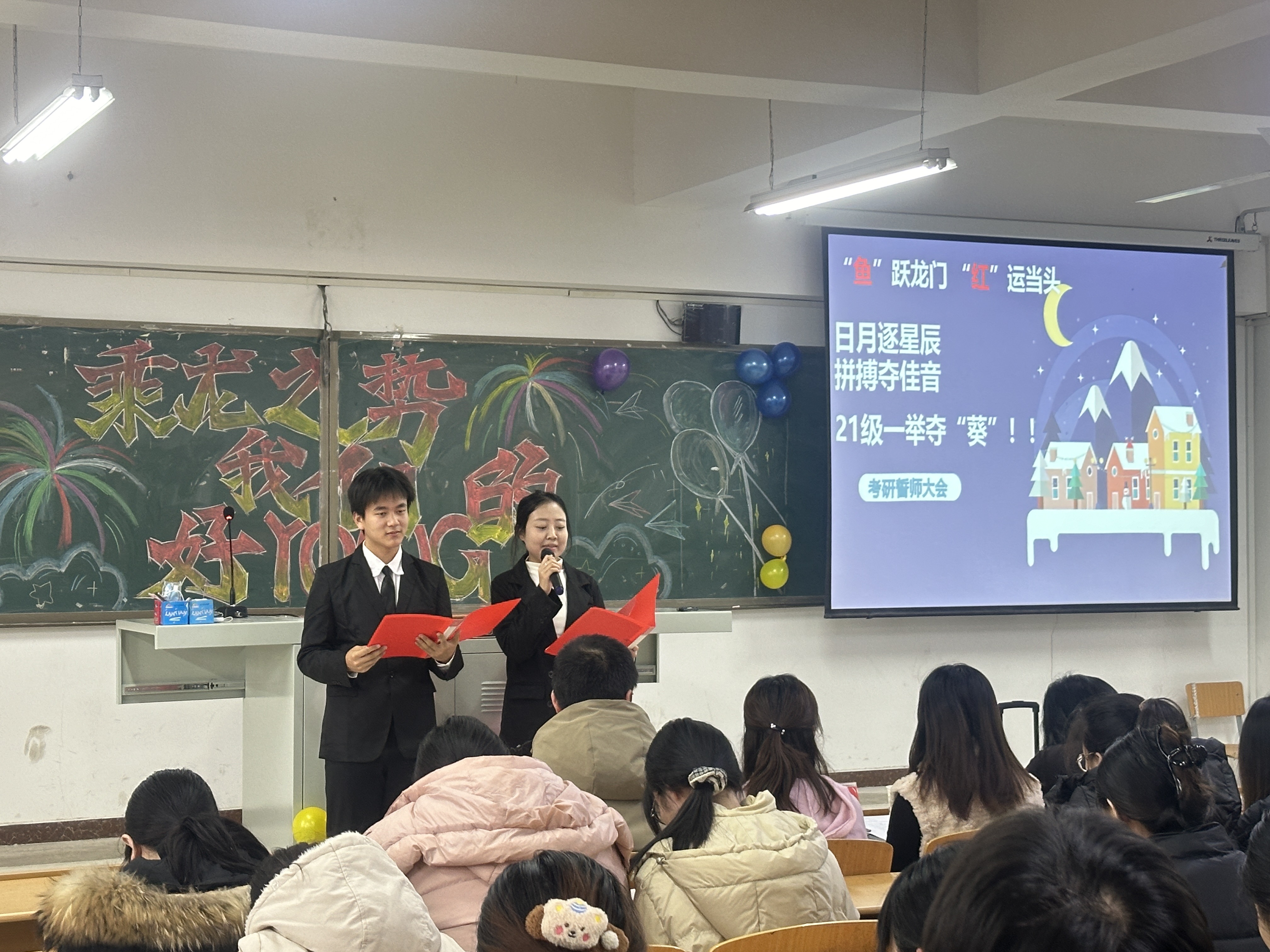 老师和同学们为考研学子精心准备了歌舞演出和诗朗诵,期待他们在欢声中一举夺魁,在暖语里摘得桂冠,翻山越岭得盛赞!