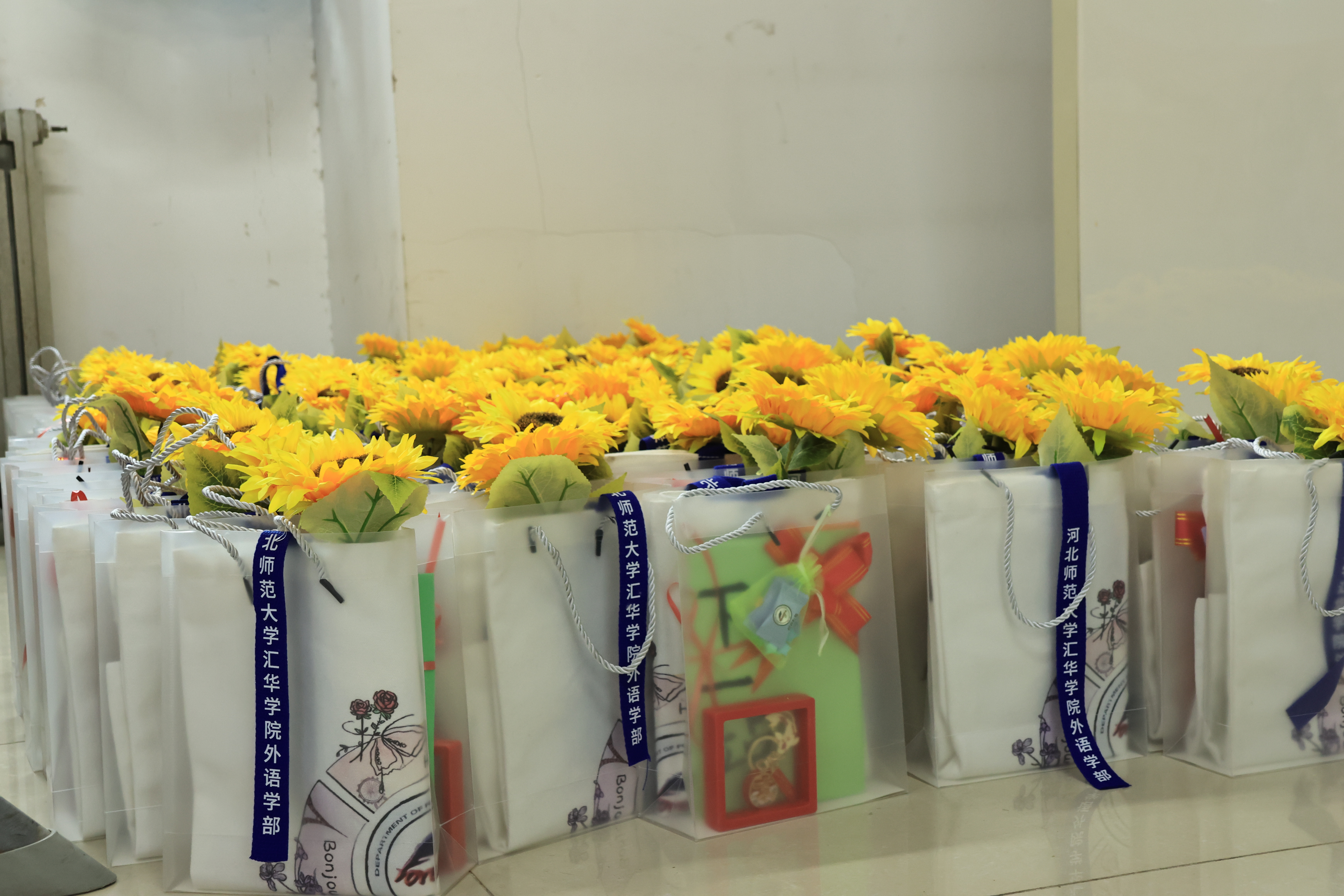 星星糖果小礼袋中每一颗星星都代表着考研学子心中的梦想与希望,期待他们在夜空中最亮的星指引下,勇敢前行。向日葵象征阳光、积极与希望,鼓励学生保持积极向上的心态,一举夺魁。志愿者们亲手制作了“上岸”贺卡,内含的千纸鹤和小船寓意一战上岸,爱伴研途。特制锦鲤徽章代表着上岸机遇和学子们勇往直前,不屈不挠的精神。外语学部还为学子们准备了极具外语特色的定制帆布袋及同学们手工制作的礼花,送上了锦上添花,前途似锦的祝愿。