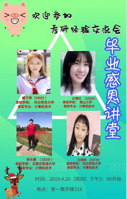 “一定要定好自己的方向与目标再努力。”已成功被燕山大学录取的白雪红在分享自己的考研历程时这样说道。“通宵达旦的学习不一定适合自己,劳逸结合很重要,学习讲究的是效率而不是坐在书本前的时间。”四位同学通过幻灯片的形式逐一分享复习规划与复习资料,认真的讲解如何选择院校、专业与导师。随后耐心的为大家解答,鼓励大家坚持梦想、脚踏实地。在座的同学们表示收获颇丰,2017级同学对考研有了更深入的了解,2016级同学有了更详细的备战计划。