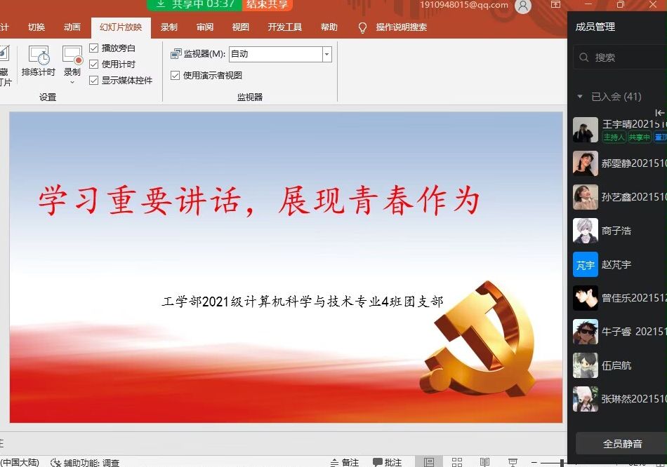 为深入学习宣传贯彻习近平总书记重要讲话精神,全面落实团十九大各项部署,引导广大团员青年紧跟党的步伐,投身强国复兴建设。按照学院团委学习要求,8月6日2021级计算机科学与技术4班团支部将主题团日活动与william“三下乡”暑期社会实践活动相结合,开展了“学习重要讲话,展现青春作为”线上交流会。