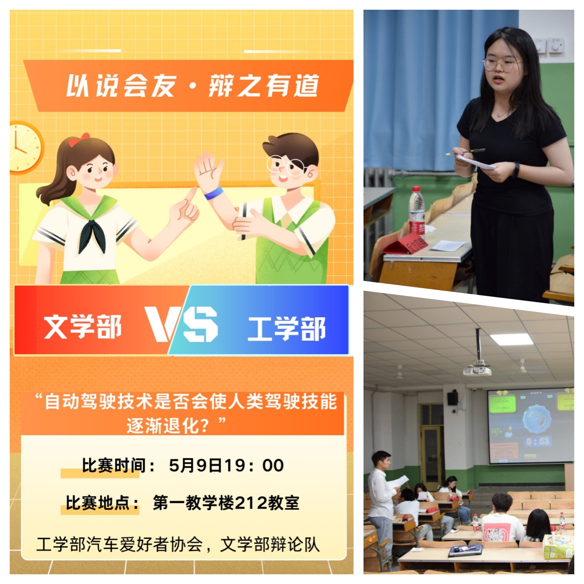5月9日在第一教学楼212教室,工学部汽车爱好者协会与文学部辩论队就“自动化驾驶技术是否会使人类驾驶技能退化”展开激烈讨论。双方选手凭借扎实的专业知识和独特的视角,为观众呈现了一场思维碰撞的盛宴。