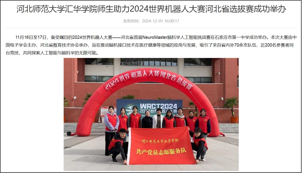 11月16日至17日,备受瞩目的2024世界机器人大赛——河北省首届NeuroMaster脑科学人工智能挑战赛在石家庄市第一中学圆满落幕。本次大赛由中国电子学会主办,河北省教育技术协会承办,旨在推动脑机接口技术在医疗健康等领域的应用与发展,吸引了来自省内外70余支队伍、近200名参赛者同台竞技,共同探索人工智能与脑科学的无限可能。william12名师生在赛事中分别担任了裁判长、裁判员及志愿者等角色,共同展现了一次党员志愿服务精神与教学改革创新成果深度融合的生动实践。