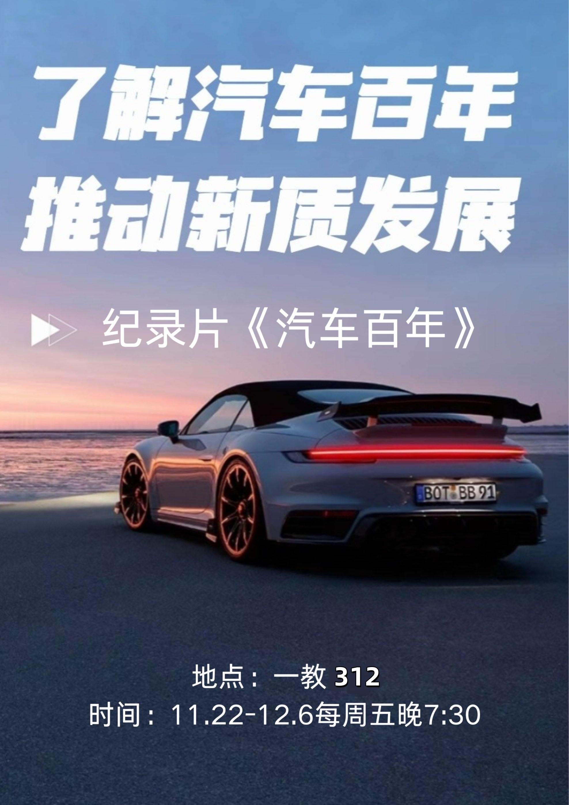 活动于11月22日启动,持续至12月6日,期间每周五晚上19:30准时举行。工学部汽车爱好者协会精心挑选了大型纪录片《汽车百年》作为观影内容,该纪录片生动展现了汽车从诞生到发展的全过程,不仅回顾了汽车工业的历史变迁,还深入探讨了其对全球经济、社会及文化的深远影响。