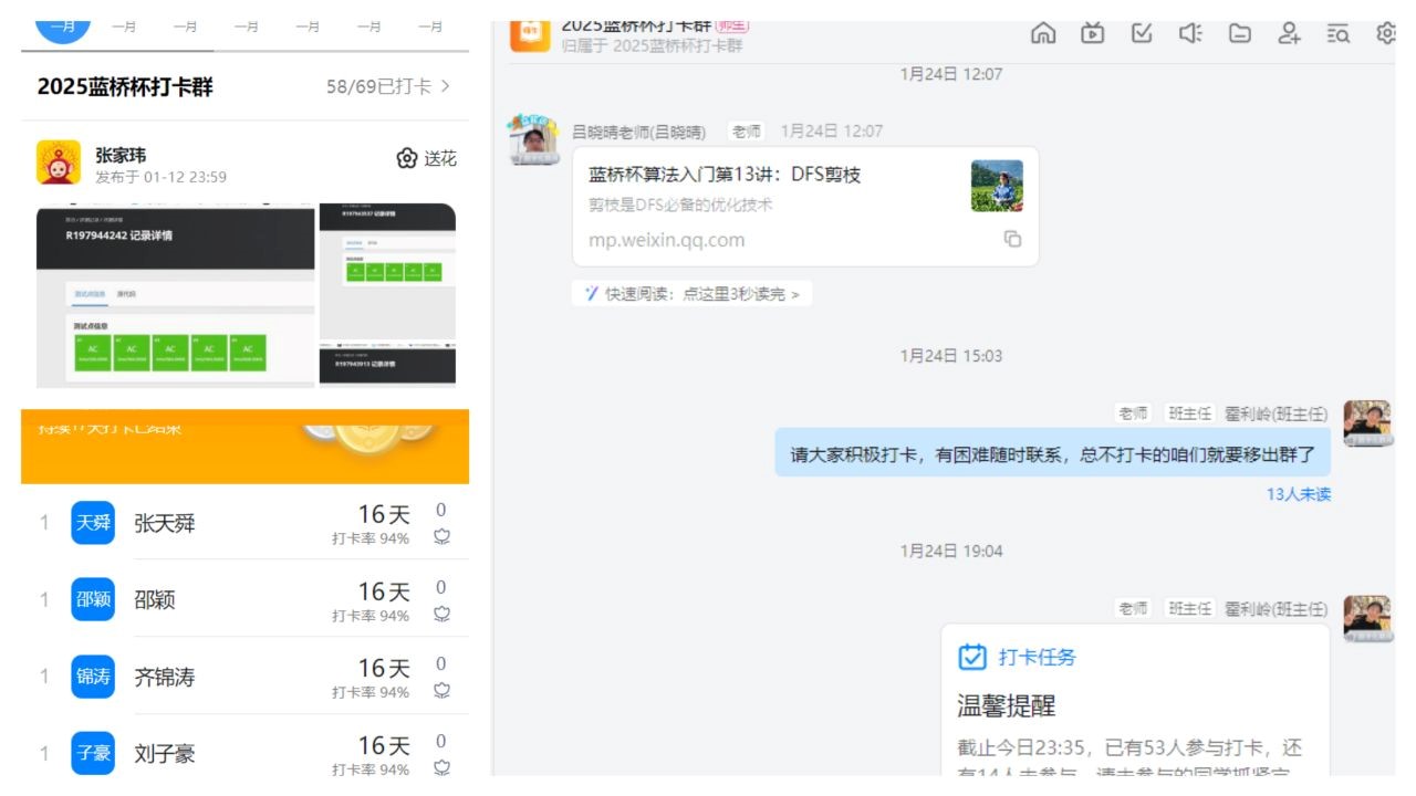 集训的学生们表现出极高的热情和积极性,他们利用寒假时间,认真备赛,不断挑战自我,提升编程技能。99名参与集训打卡的学生中打卡天数15天以上的超过了60人。许多学生表示,通过参与寒假的集训打卡活动不仅提高了自己的编程能力,还培养了解决问题的思维方式,对未来的学业和职业发展都有很大的帮助。
