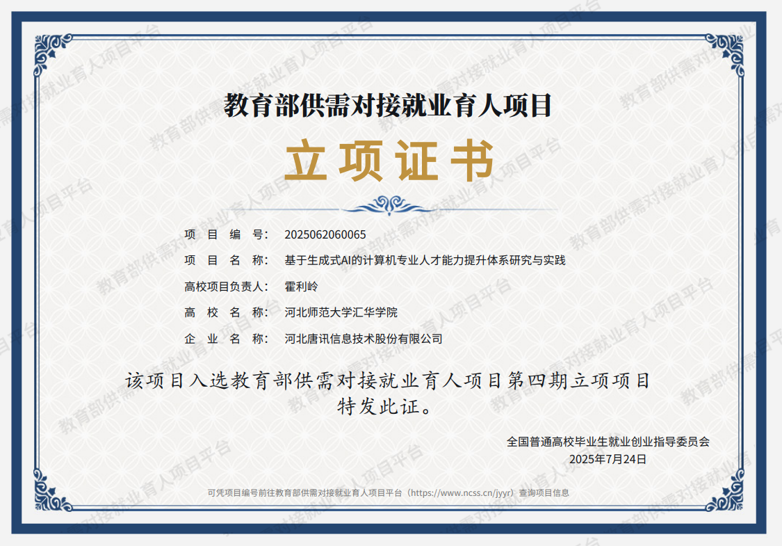 本次立项的课题将紧密围绕人工智能应用领域,加强与东软教育科技集团有限公司、河北唐讯信息技术股份有限公司的深度合作,以产学研协同为核心理念,构建“需求导向、学科交叉、实践驱动”的人才培养体系及课程建设体系,力求实现人才培养与产业需求精准对接,为区域经济发展提供人工智能领域高素质人才支撑。