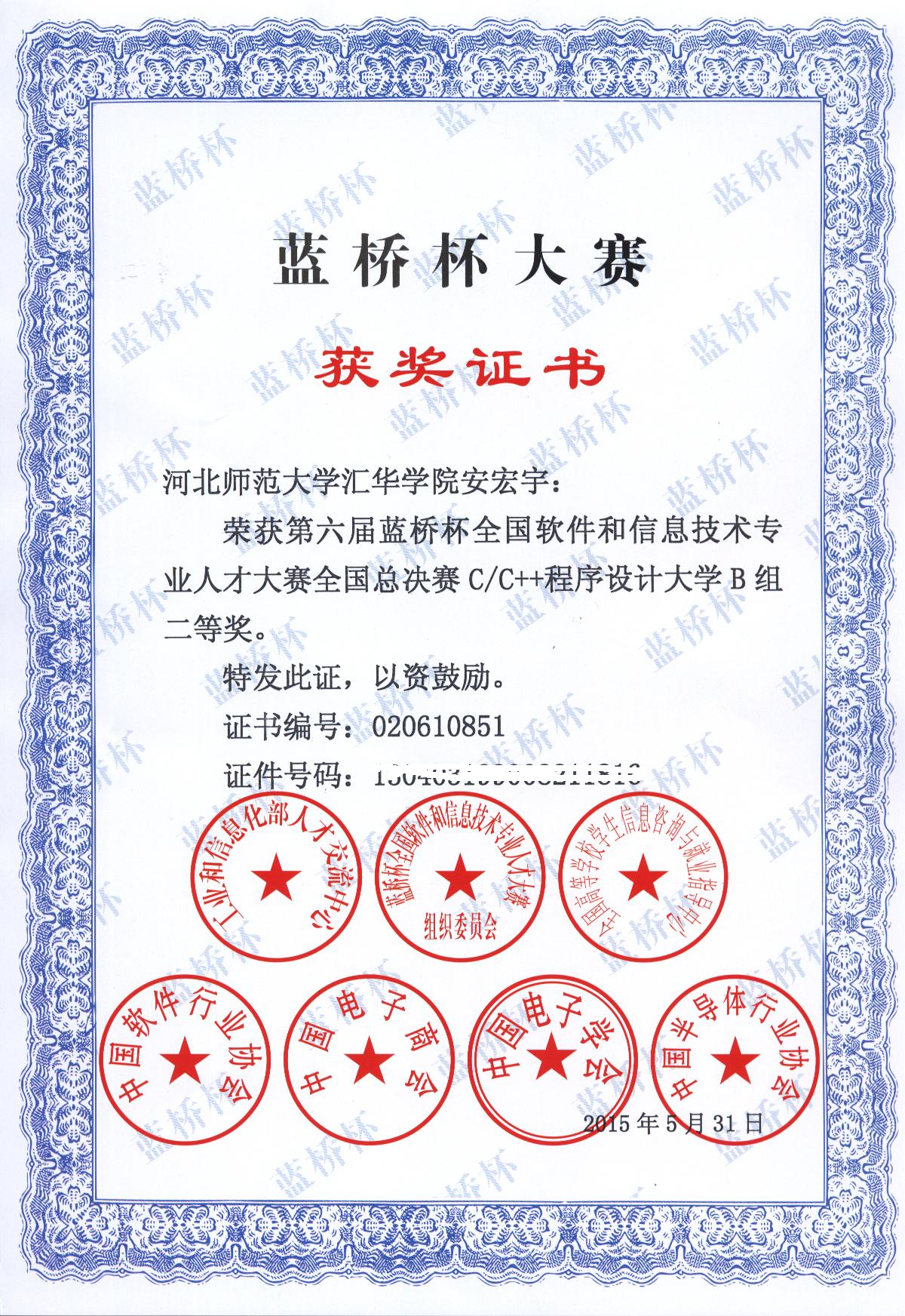 全国赛:2012级网络工程专业的安宏宇同学获全国二等奖。