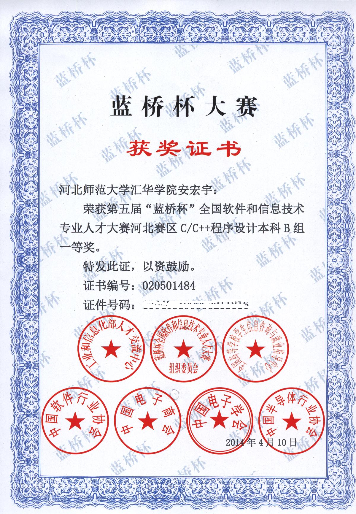 2012级网络工程专业的安宏宇获得省级一等奖;2013级网络工程专业的陈凯鹏、2013级计算机科学与技术专业的王小敏、张竞尧等同学获得省级二等奖;2013级网络工程专业的郑梦芸以及2013级计算机科学与技术专业的黄蕾、石毓同学获得省级三等奖。