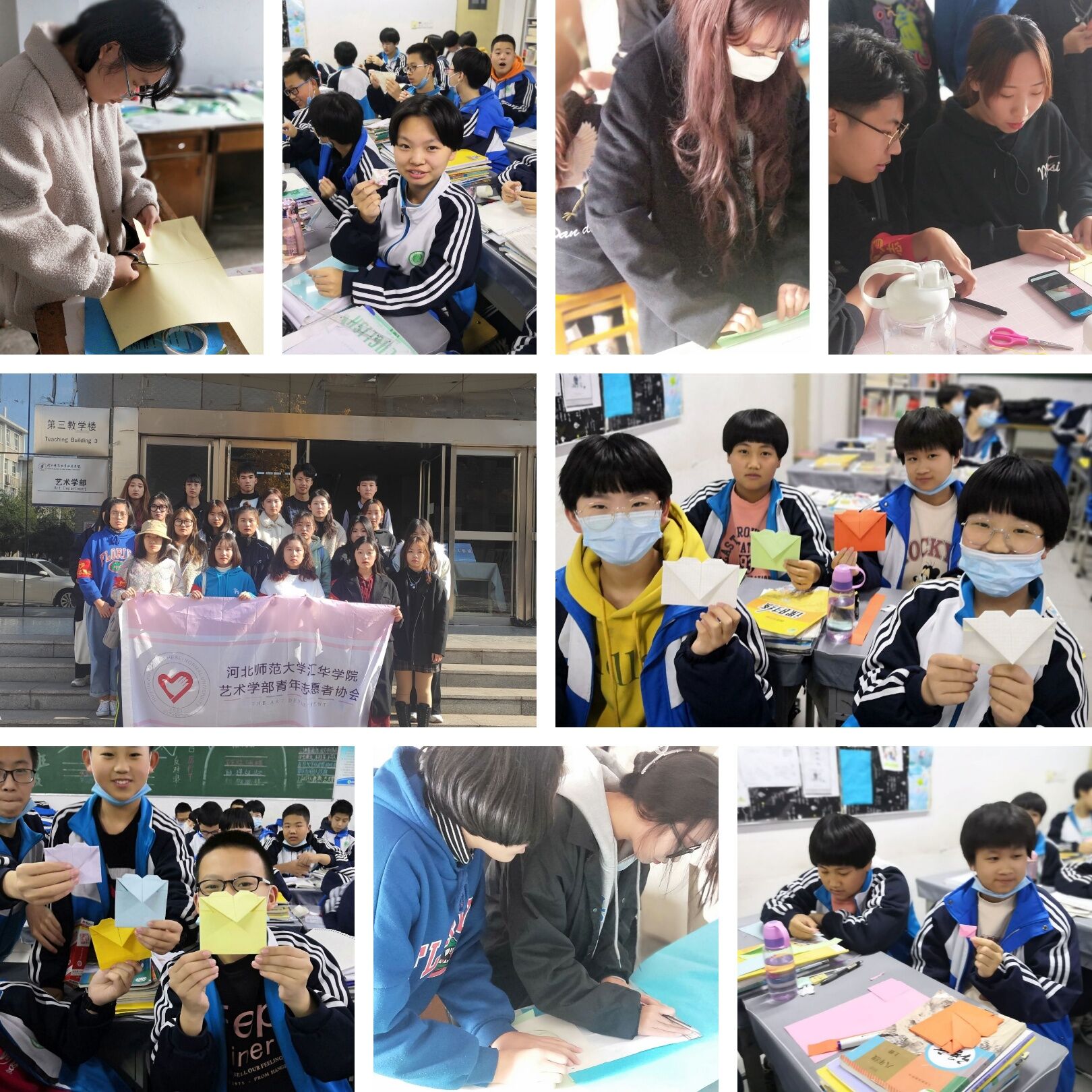 艺术青协结合专业所长,精心设计书信样式,绘制简约图形图案,配以幽默风趣的讲解,录制30分钟书信制作课程小视频。并通过视频与中学学生互动。活动中同学们学习热情高涨,认真完成信封制作,主动了解信件格式。在志愿者们耐心细致的讲解下,一封封精美信笺五彩纷呈。