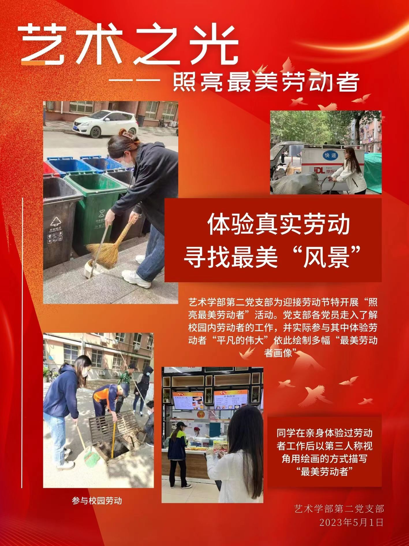 “五一”国际劳动节到来之际,艺术学部第二党支部开展“艺术之光---照亮最美劳动者”志愿服务活动。支部全体党员走入了解校园内劳动者的工作岗位,为他们绘画,并亲身参与其中,真正体验劳动者“平凡的伟大”。