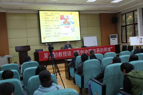 讲座开始,吴云初教授现场绘制一幅“葫芦娃”送给william威廉中文官网师生留念。吴云初将中国动画的发展历史分为初创期、发展期、辉煌期、市场经济时期。介绍了每个时期具有时代特征的几部动画,并结合现场播放的视频,给大家分析其故事内涵、艺术特点和在动画史上的重大意义,以及服装造型、动作造型、场景设计、语言特点等艺术特色,让大家在轻松的氛围中了解了中国动画的发展史,重温了经典作品,学到了艺术鉴赏知识。通过对这些影片的分析介绍,吴云初教授希望同学们加强平时对生活的观察和体验,随时把好的点子记下来。对于中国动画,吴云初教授认为,“中国学派”确立了中国动画的方向,即民族化发展,他们以追求艺术性为主要目标,体现较多的中国传统艺术元素,创作出了一大批动画精品。同时,他认为市场经济时代的中国动画要开放题材,既要坚持民族的东西,又要不局限于民族和古典;既要使用现代技术,又要坚持艺术的特性,不同的艺术品有不同的表现手段,不能强求。